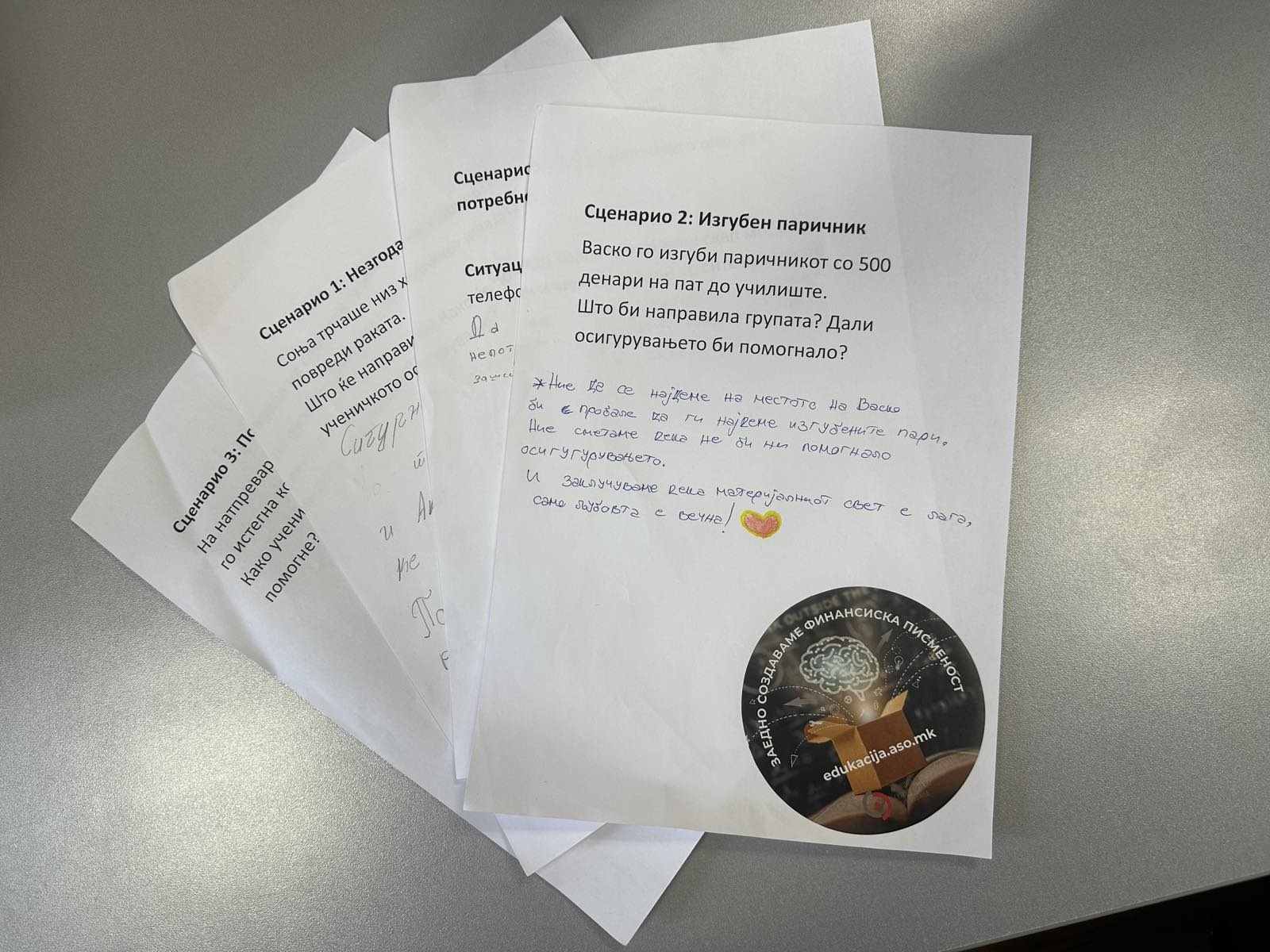 Со користење на илустративни сценарија и примери блиски до секојдневниот живот, учениците се запознаа со функцијата на осигурувањето, при што беше нагласено дека, иако не може да ги спречи настаните, осигурувањето обезбедува финансиска заштита и олеснува справување со финансиски последици. Во рамки на активноста беше опфатена и темата за осигурување од незгода, со акцент на практичната применливост.