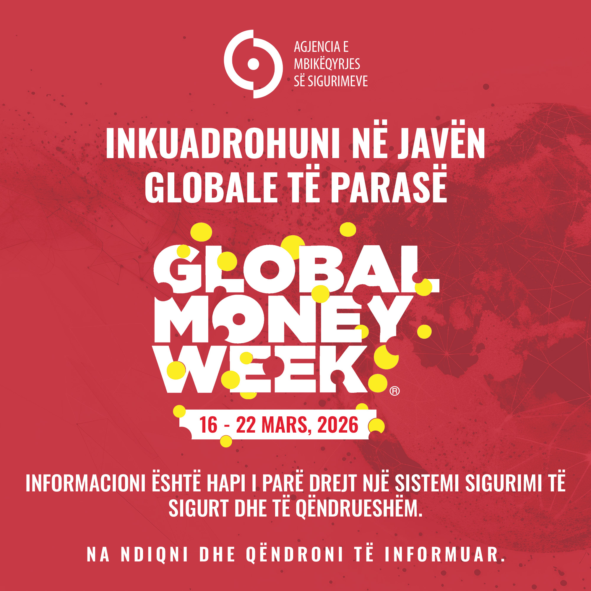 Agjencia e Mbikëqyrjes të Sigurimeve, Ministria e Financave, Komisioni i Letrave me Vlerë, Agjencia  e Mbikëqyrjes të Financimit Kapital të Sigurimit Pensional dhe Banka Popullore, në bashkëpunim me shoqatat dhe institucionet nga sektori privat dhe ai civil që janë aktive në fushën e edukimit financiar, në periudhën prej dates 16 deri më 22 mars të vitit 2026, për të 14-in vit radhazi do ta shënojnë Javën Globale të Parasë.